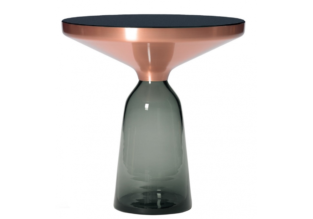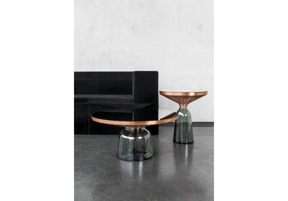 Bell Copper conçue par Sebastian Herkner pour ClassiCon est une table d'appoint réalisée avec une base en verre soufflé à la bouche en gris quartz, un plateau en métal en cuivre massif et un plateau en verre cristal laqué noir.