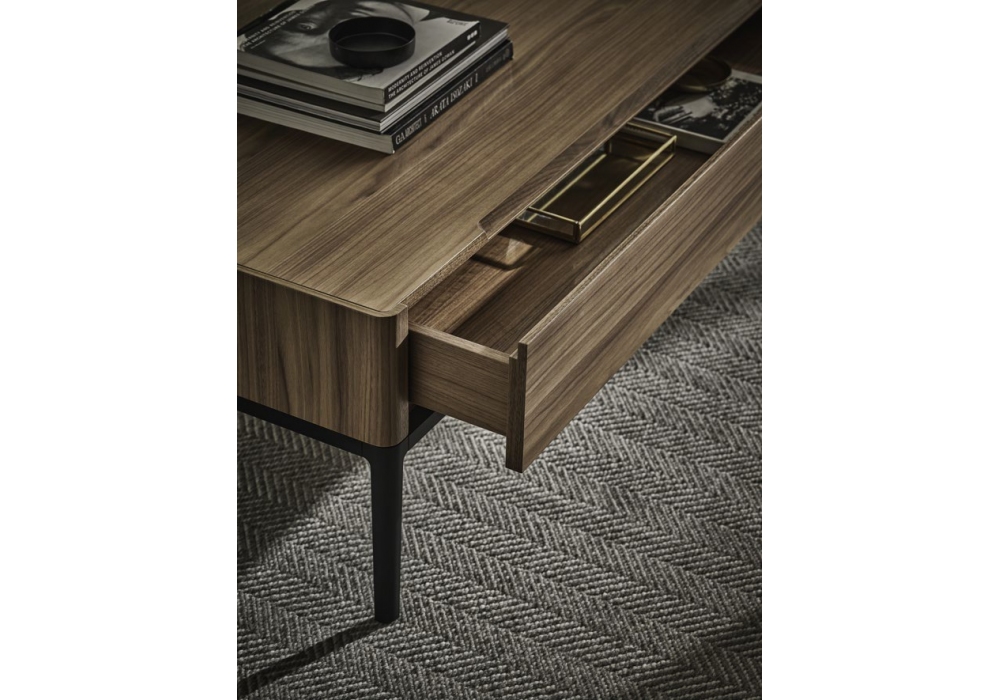 Chiba conçue par D. Dolcini pour Porada est une table basse avec tiroirs en noyer Canaletta et structure en aluminium peint noir mat.