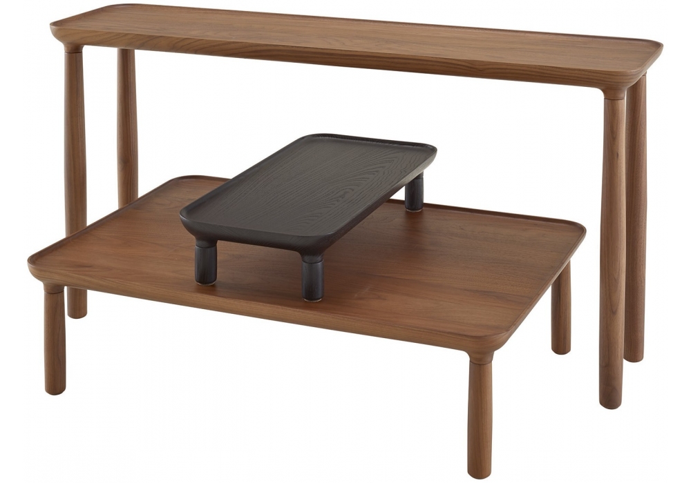 Lotis conçu par Oleg Pugachev pour Ligne Roset est un ensemble de tables d'appoint en bois massif (noyer et frêne) pouvant être disposées les unes sur les autres. A noter le travail particulier de verrouillage du pied sur le plateau. Avec patins en feutre.