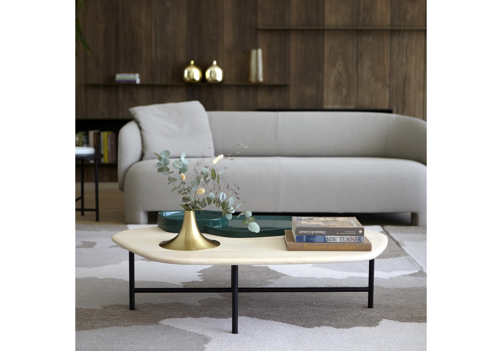 Lewa conçue par Sebastian Herkner pour Ligne Roset est une table basse avec base en acier laqué noir avec finition satinée, plateau en frêne massif avec plateaux en céramique imprimée émail brillant. Disponible en 2 versions.