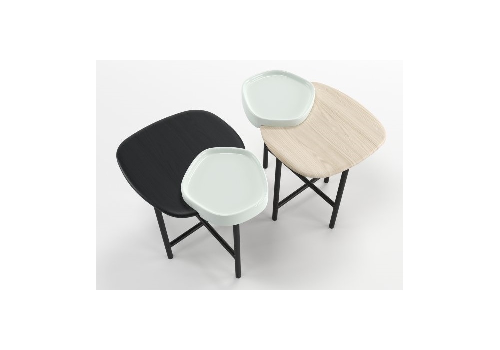 Lewa conçue par Sebastian Herkner pour Ligne Roset est une table d'appoint avec base en acier laqué noir avec finition satinée, plateau en frêne massif avec plateaux en céramique imprimée émail brillant. Disponible en 2 versions.