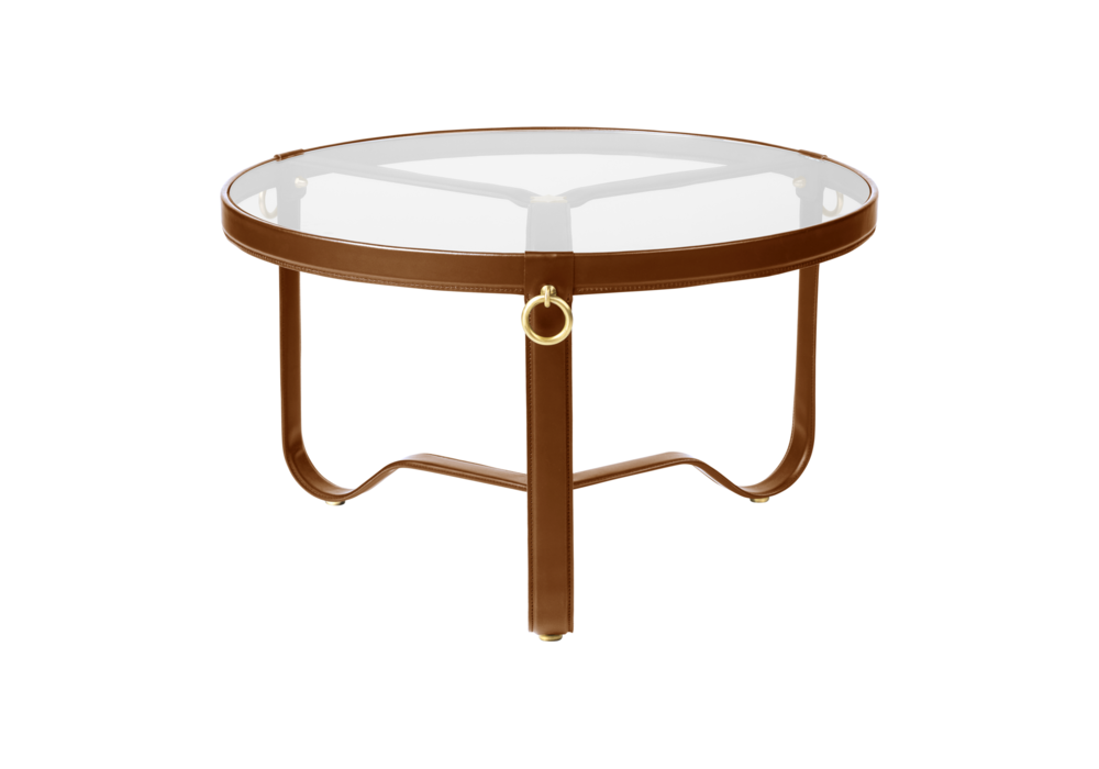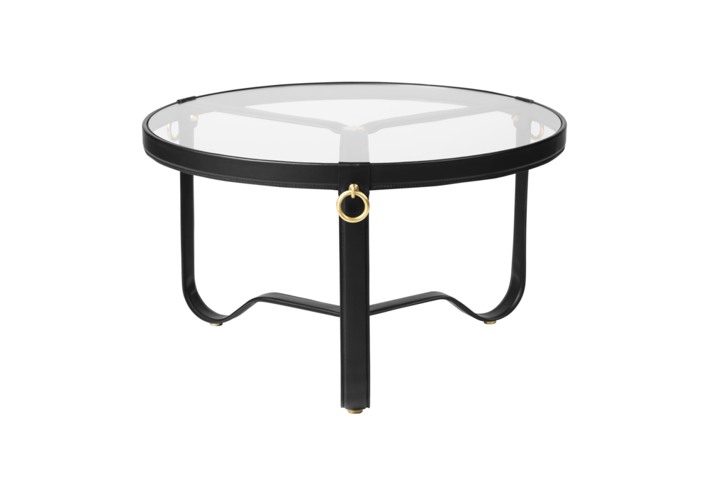 Adnet conçue par Jacques Adnet pour Gubi est une table basse ronde composée d'une structure rembourrée en cuir et d'un plateau en verre.