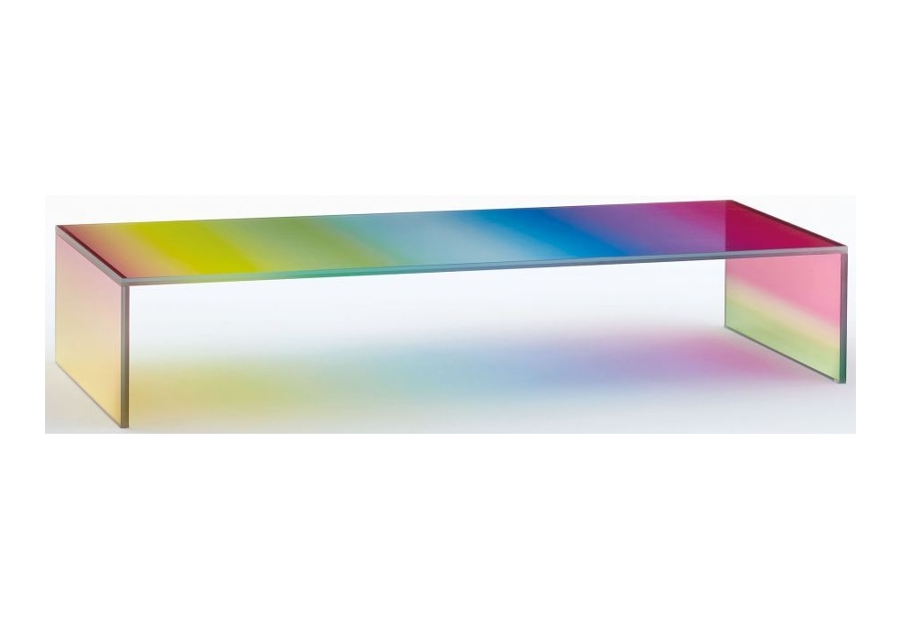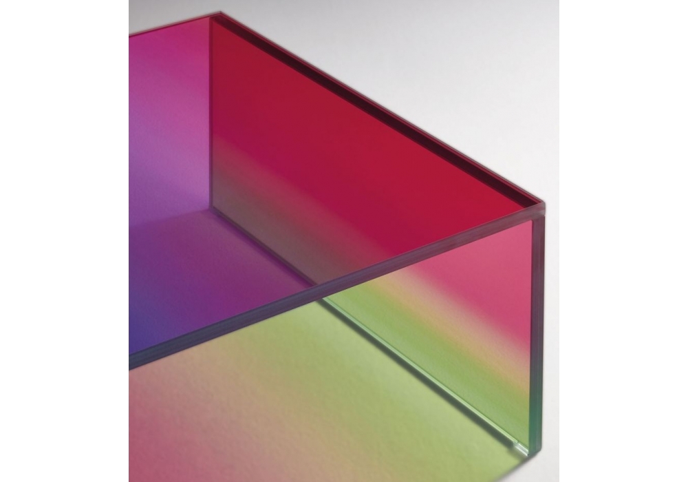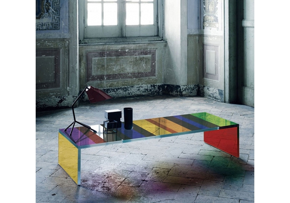 The Dark Side of the Moon conçue par Piero Lissoni pour Glas Italia est une table basse à pont en verre extralight stratifié avec une technique de traitement sophistiquée, grâce à laquelle le plateau et les côtés sont caractérisés par une finition multicolore. Disponible en deux versions : l'une rayée, l'autre en coloris dégradés.