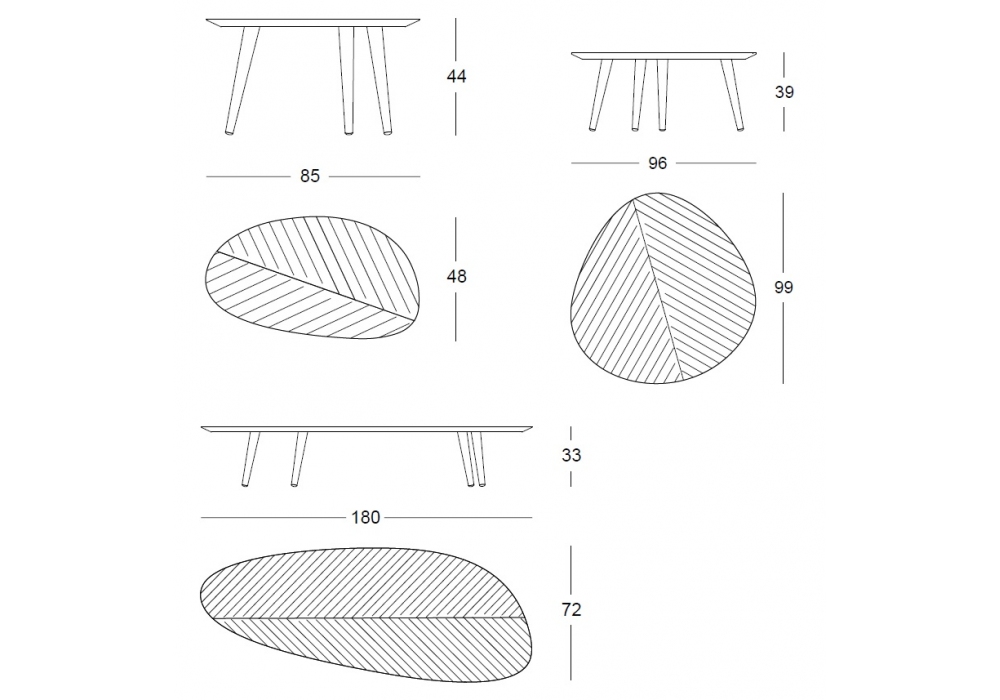 | Dimensions | 85 x 48 x H 44 cm; 96 x 99 x H 39 cm; 180 x 72 x H 33 cm. |