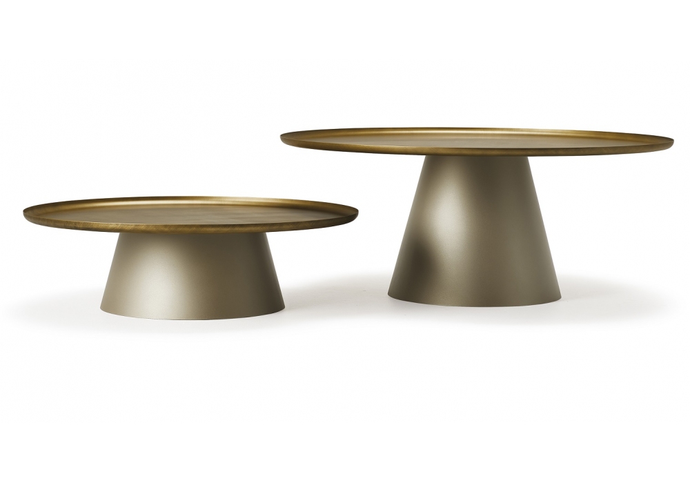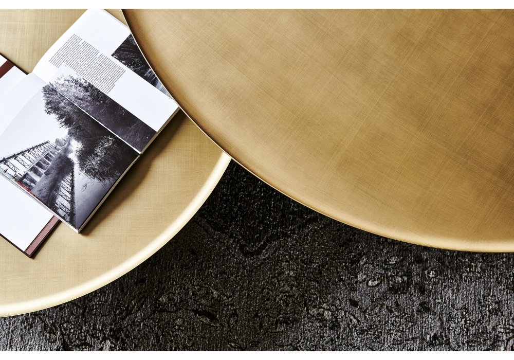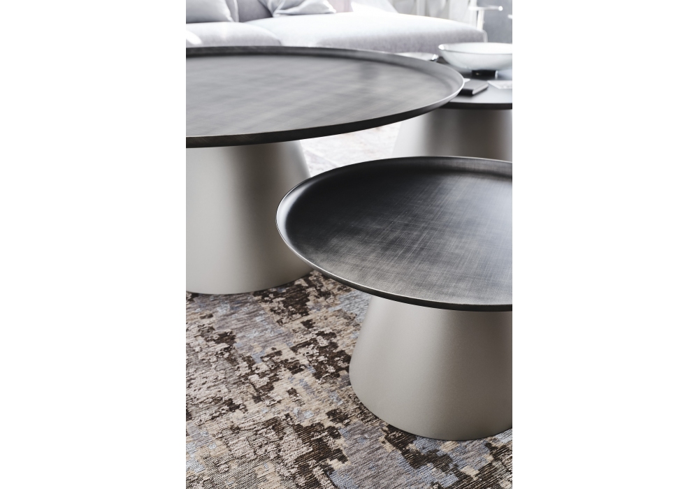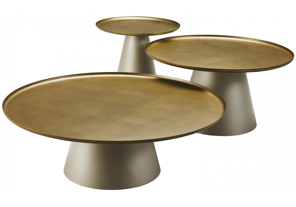 Amerigo conçue par Giorgio Cattelan pour Cattelan Italia est une table basse avec plateau en acier Brushed Brass, Brushed Bronze ou Brushed Grey et base en acier laqué gaufré titane.
