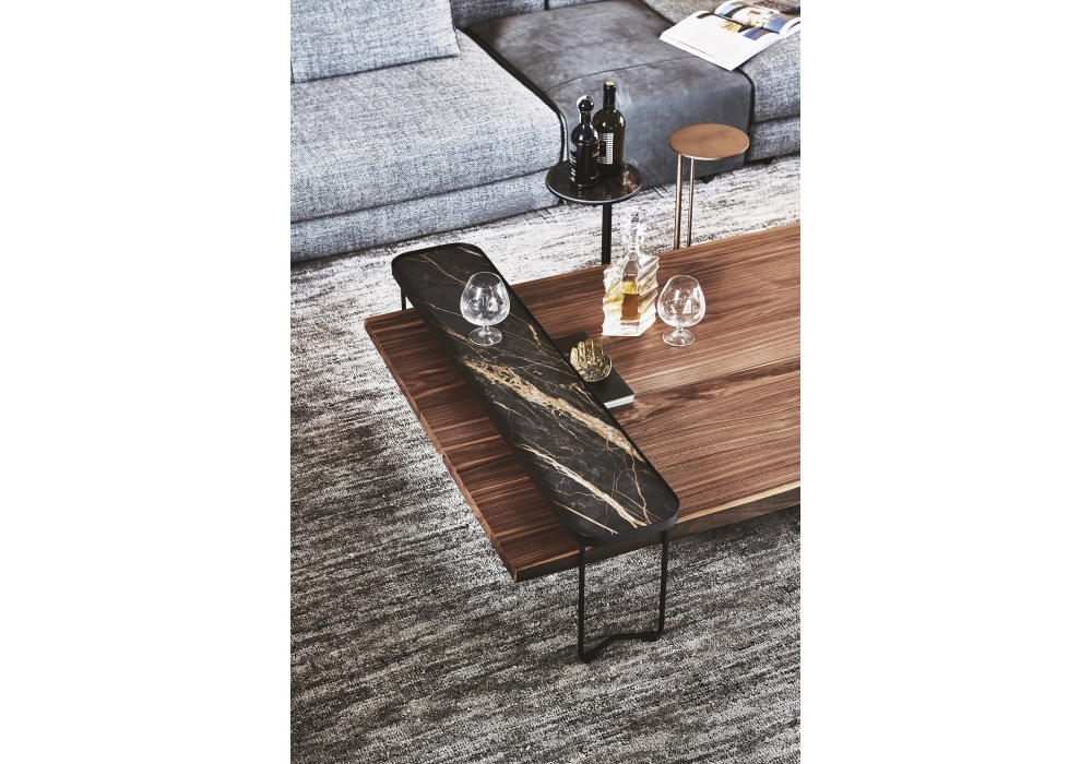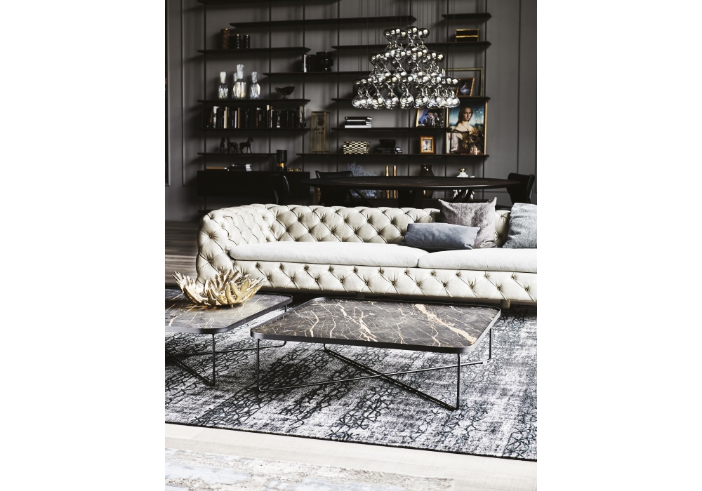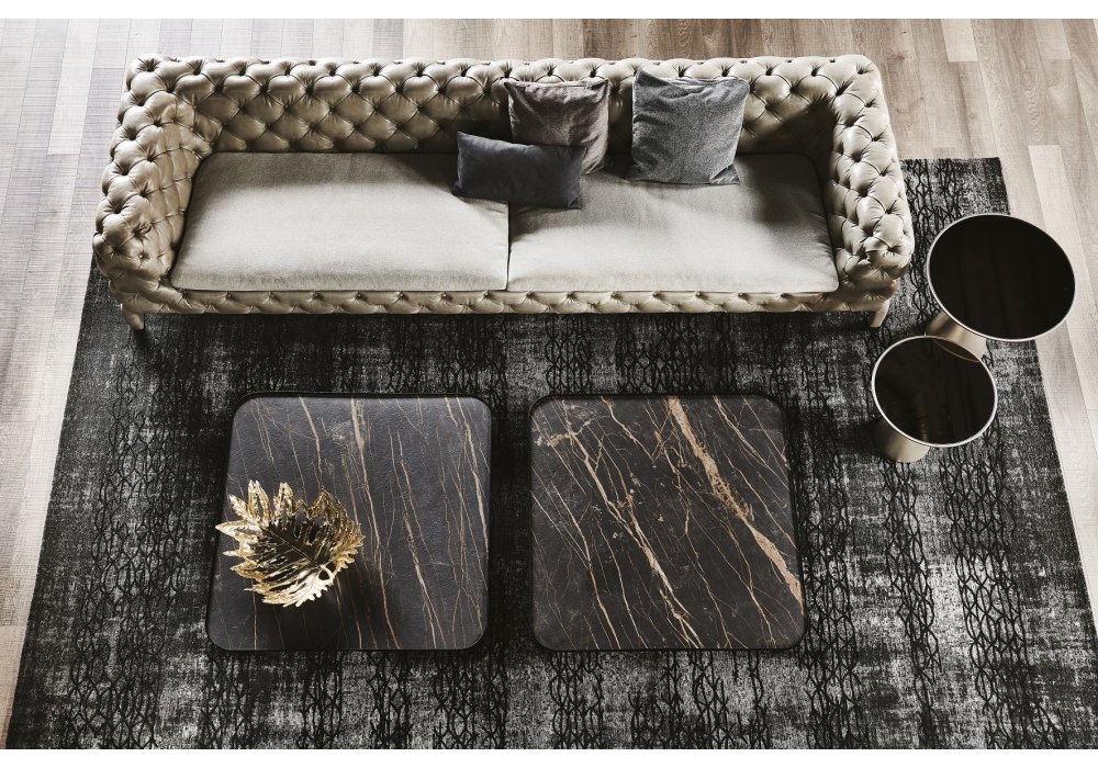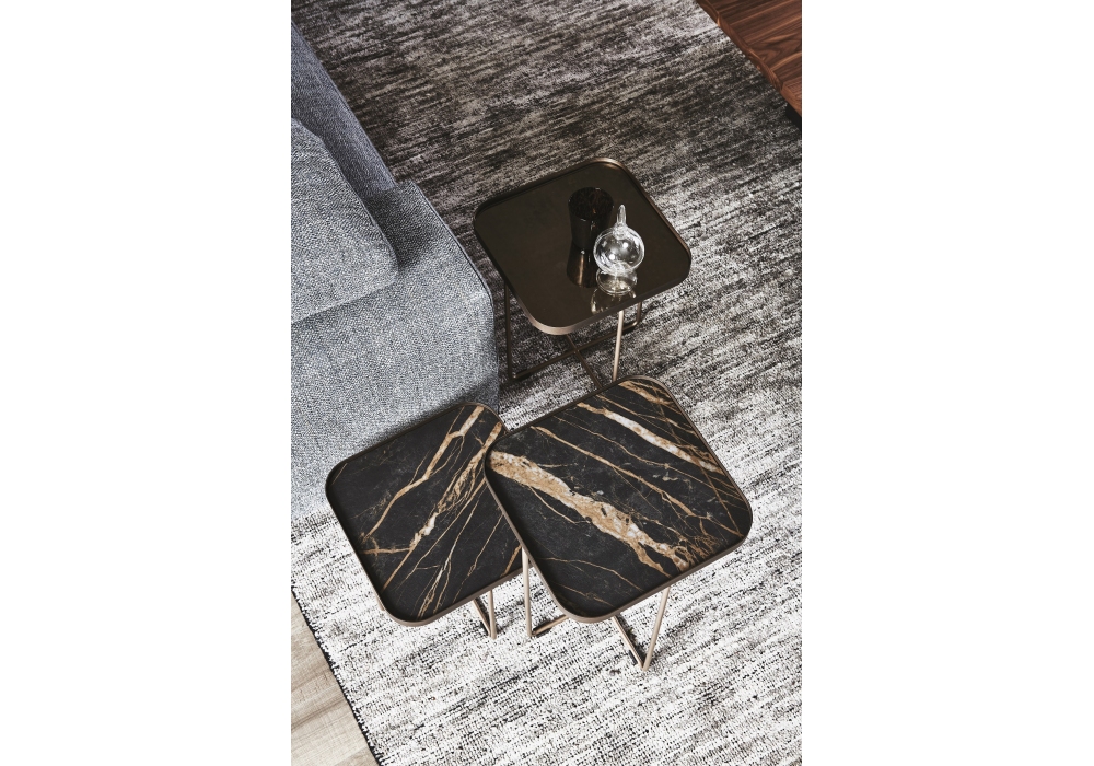 Benny Keramik conçue par Studio Kronos pour Cattelan Italia est une table basse avec plateau en céramique Marmi en plusieurs coloris. Structure en acier laqué gaufré noir ou titane ou base en Bronze et cadre supérieur en Brushed Bronze.