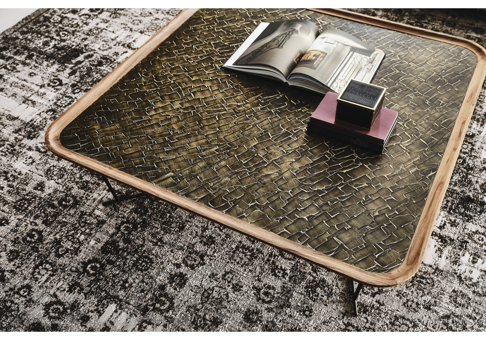 Sinai conçue par Giorgio Cattelan pour Cattelan Italia est une table basse avec plateau spatulé avec cadre en bois massif noyer Canaletto et structure en acier laqué gaufré noir. La finition est spatulé à la main et chaque produit est unique.