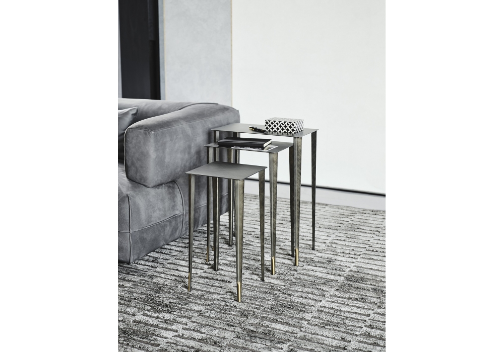 Spillo conçue par Giorgio Cattelan pour Cattelan Italia est une collection de tables d'appoint composées d'une structure en Brushed Brass, Brushed Bronze ou Brushed Grey et détails en laiton.