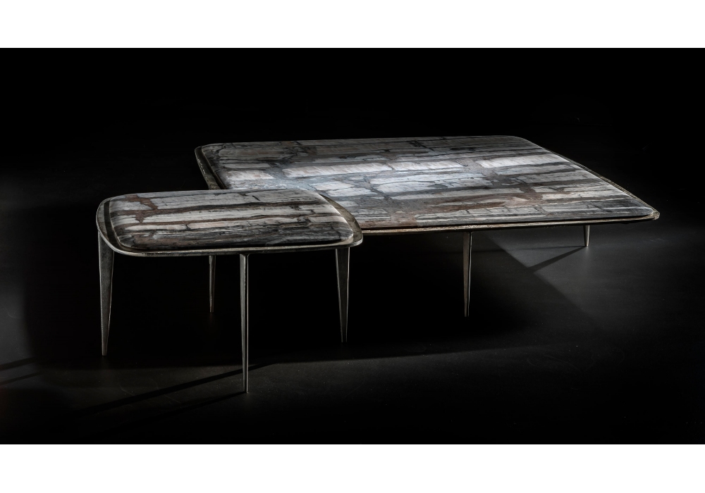 Big Bang conçue par Massimo Castagna pour Henge est une table d'appoint avec structure en métaux coulés au sable et plateau niché en pierre.