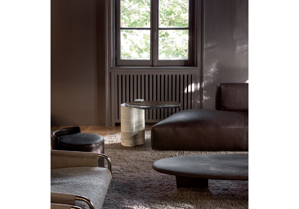 Plynto conçue par Ugo Cacciatori pour Henge est une table d'appoint composée d'une base en pierre et d'un plateau pivotant en verre moulé finition Steel Grey.