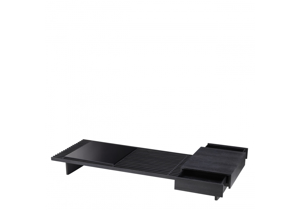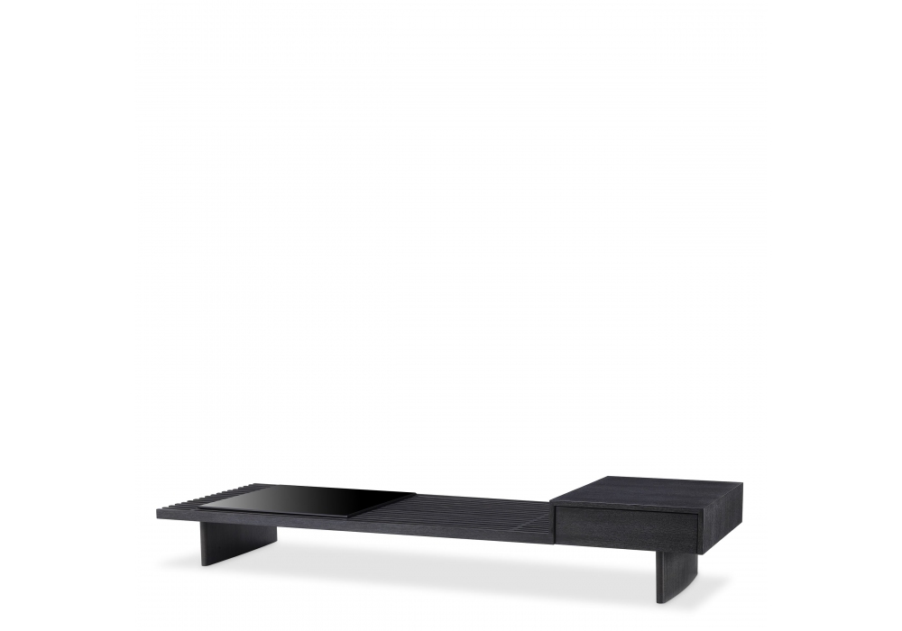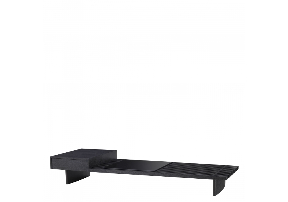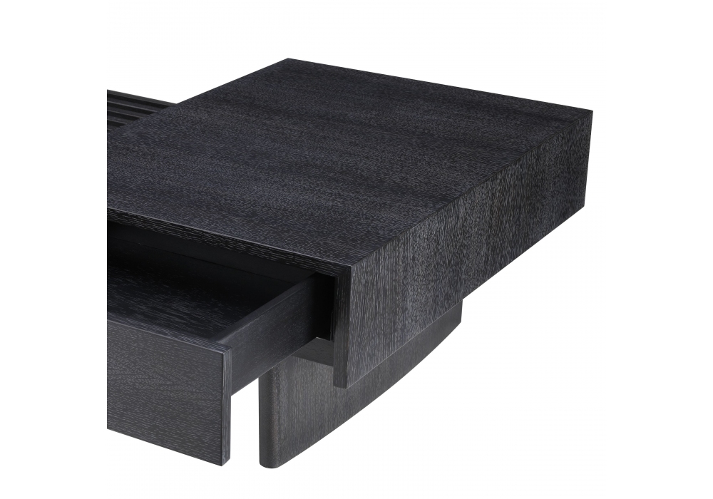 La Crust conçue par Eichholtz est une table basse rectangulaire en placage de chêne anthracite dotée d'un plateau en verre fumé et de deux tiroirs de rangement.