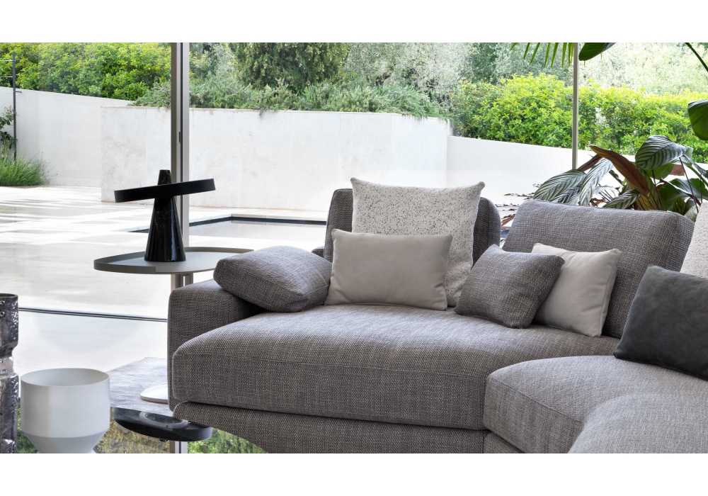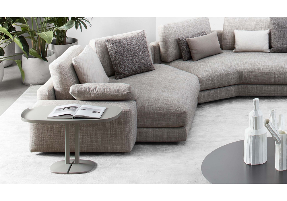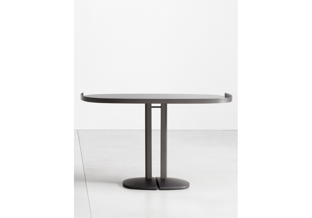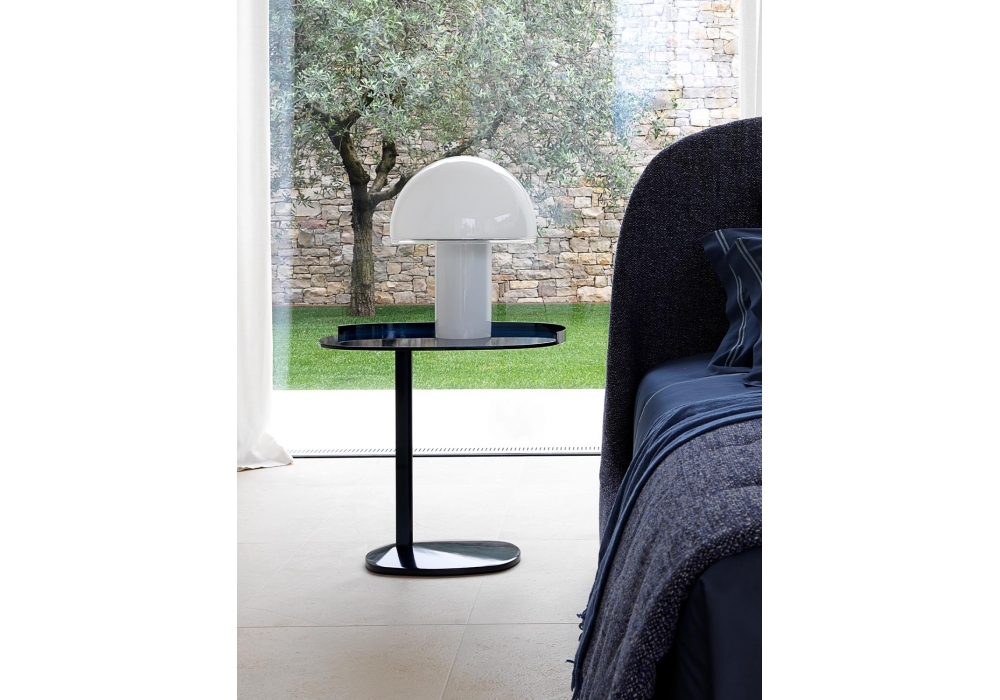 Victoria conçue par Emanuela Garbin pour Flou est une table d'appoint avec plateau de forme ovale et structure en métal bruni. Disponible en deux modèles : un ou deux pieds. Socle en bois verni de la même couleur que la structure.
