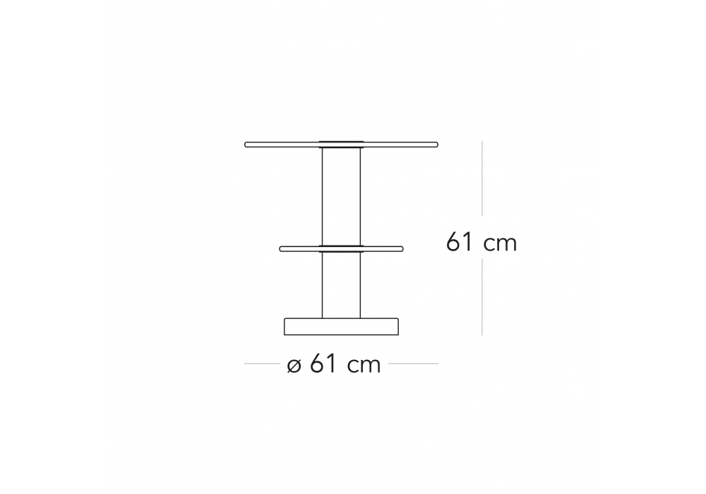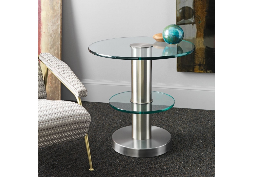 Tavolino 1932 conçue par Gio Ponti pour Fontana Arte est une table d'appoint composée d'une structure cylindrique en métal nickelé brossé et de deux étagères en verre flotté de 15 mm d'épaisseur de forme circulaire.