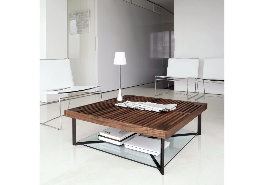 Ponton conçue par Osko + Deichmann pour Ligne Roset est une table basse avec surface supérieure en noyer massif légèrement huilé et verni clair, reposant sur une structure en acier. Disponible en 3 dimensions.