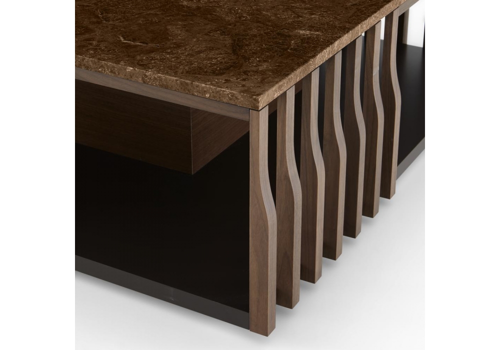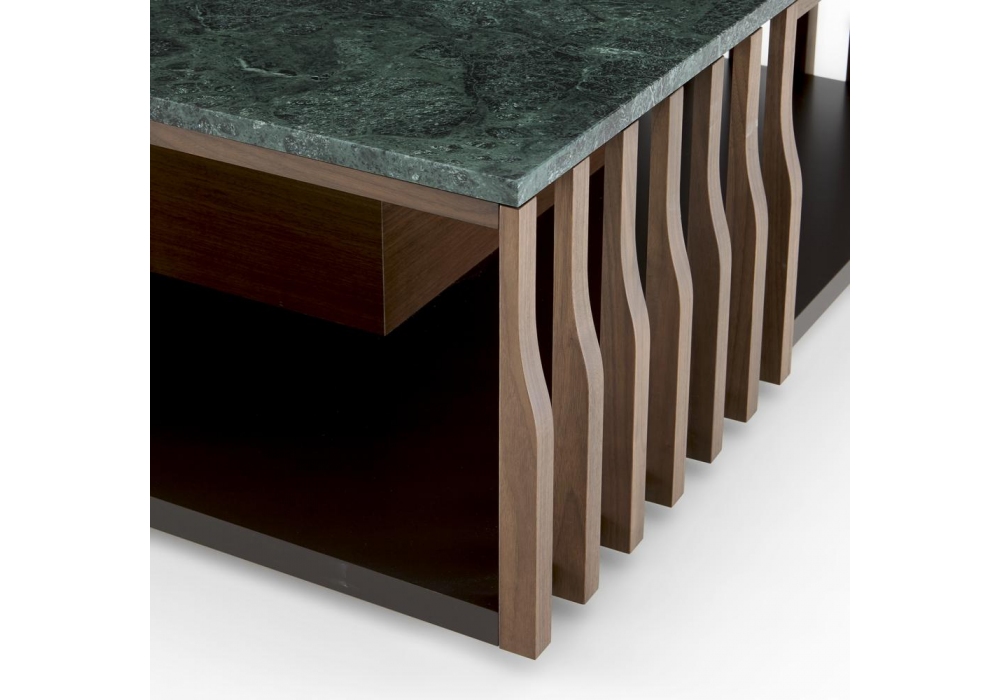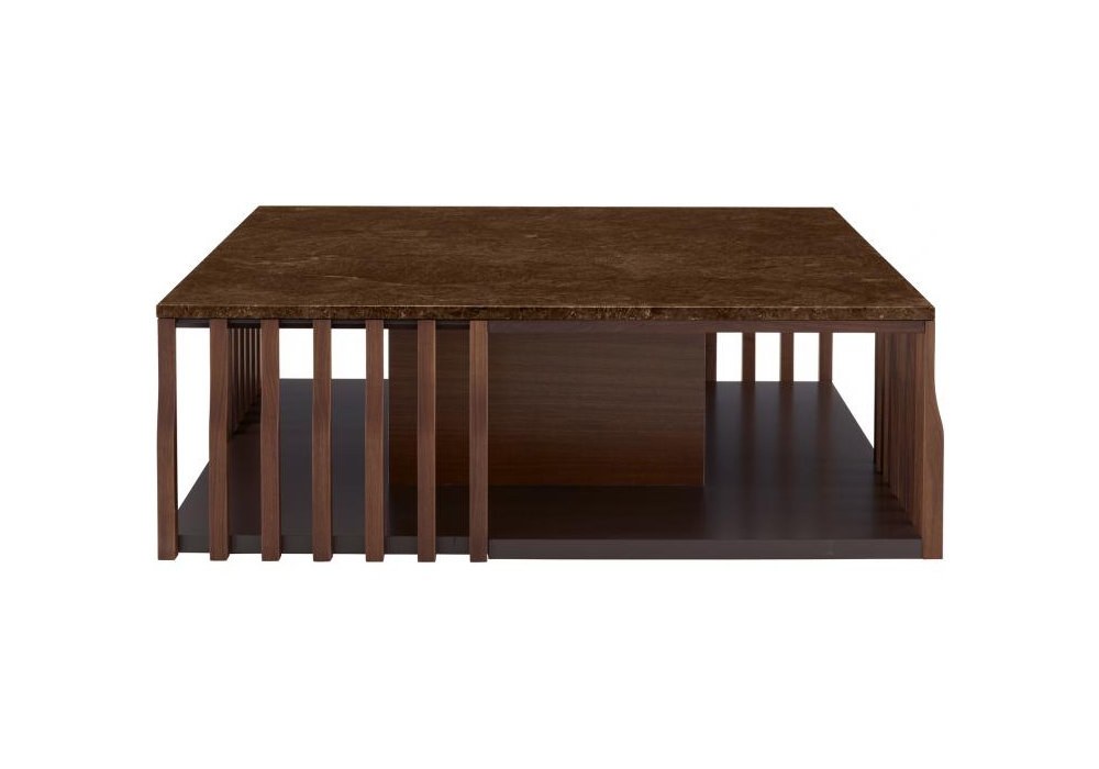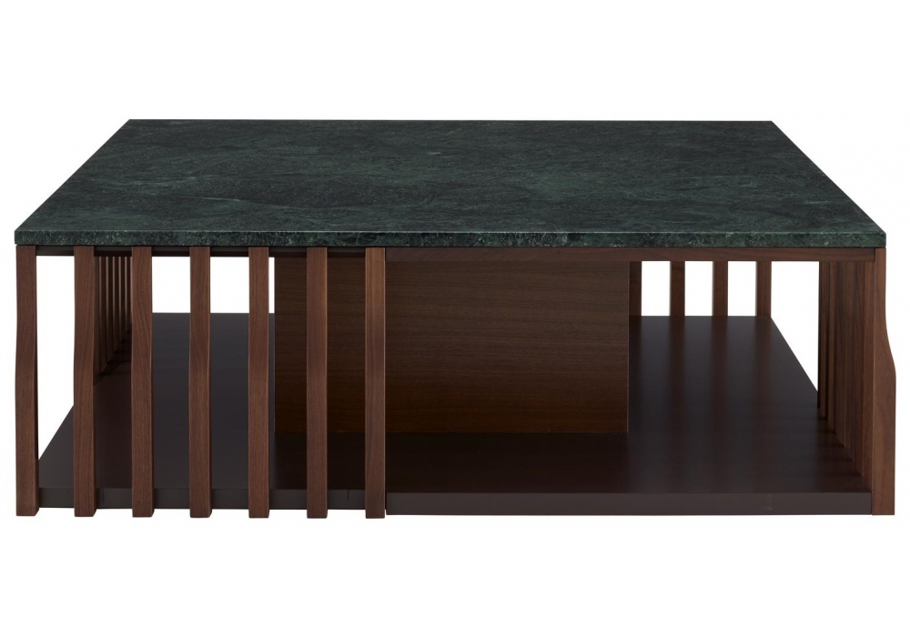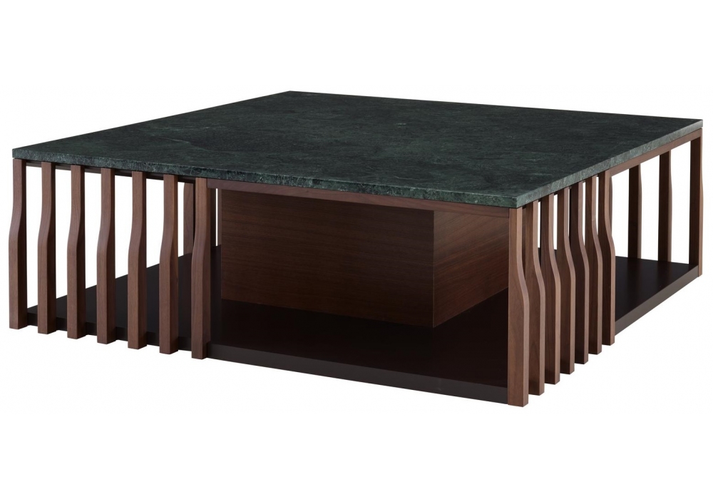 Utopia conçue par Eric Jourdan pour Ligne Roset est une table basse carrée avec plateau en marbre disponible en 2 finitions et base en noyer américain massif teinté foncé.