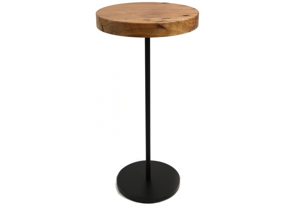 Chanterelle conçue par Ligne Roset est une table d'appoint avec structure en acier chromé brillant ou laqué noir; plateau en rondin de noyer massif avec nœuds et fissures visibles. Le diamètre du plateau varie entre 25 cm et 30 cm.