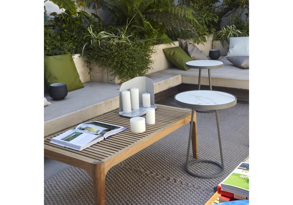 Circles Outdoor conçue par Maria Jeglinska pour Ligne Roset est une table d'appoint d'extérieur avec structure en acier traité par cataphorèse laqué gris quartz. Plateau en grès céramique effet marbre blanc mat.