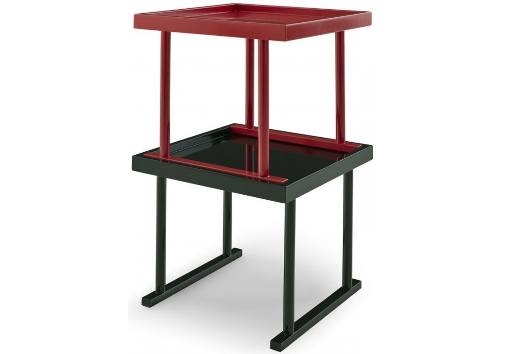 Môme conçue par Lily Saillant pour Ligne Roset est une table basse en bois laqué rouge foncé ou noir brillant. Peut être combiné pour créer une grande table basse, ou empilé pour créer un rangement à petite échelle.