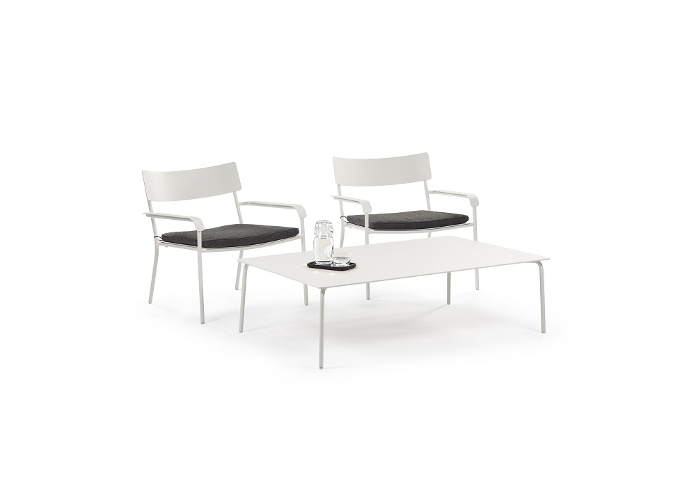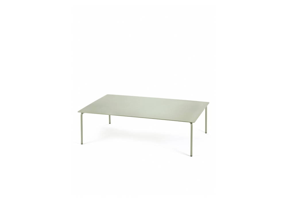 August Firma von Vincent Van Duysen für Serax ist ein Table pour extérieur ou intérieur, structure et plateau quadrangulaire en aluminium disponible dans les couleurs ; eucalyptus noir, vert ou sable.