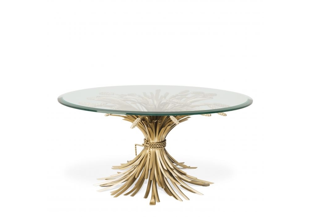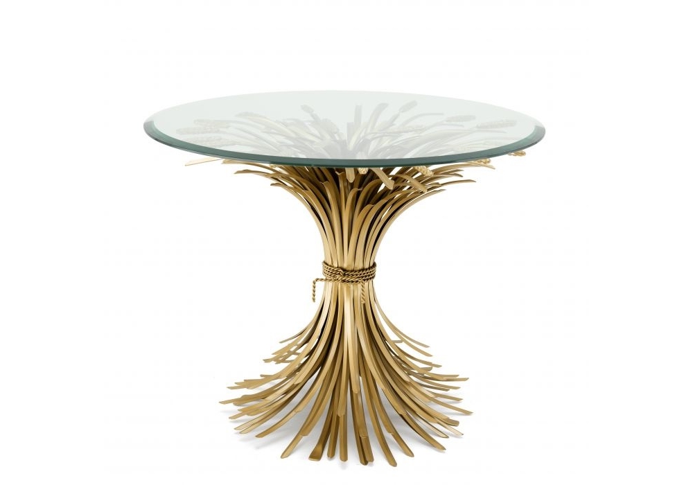 Side Table Bonheur conçue par Eichholtz est une table d'appoint travaillée en fer avec une finition or antique, elle comprend une base en forme de touffe d'herbe et de pointes et un plateau en verre transparent biseauté. Disponible en différentes tailles.