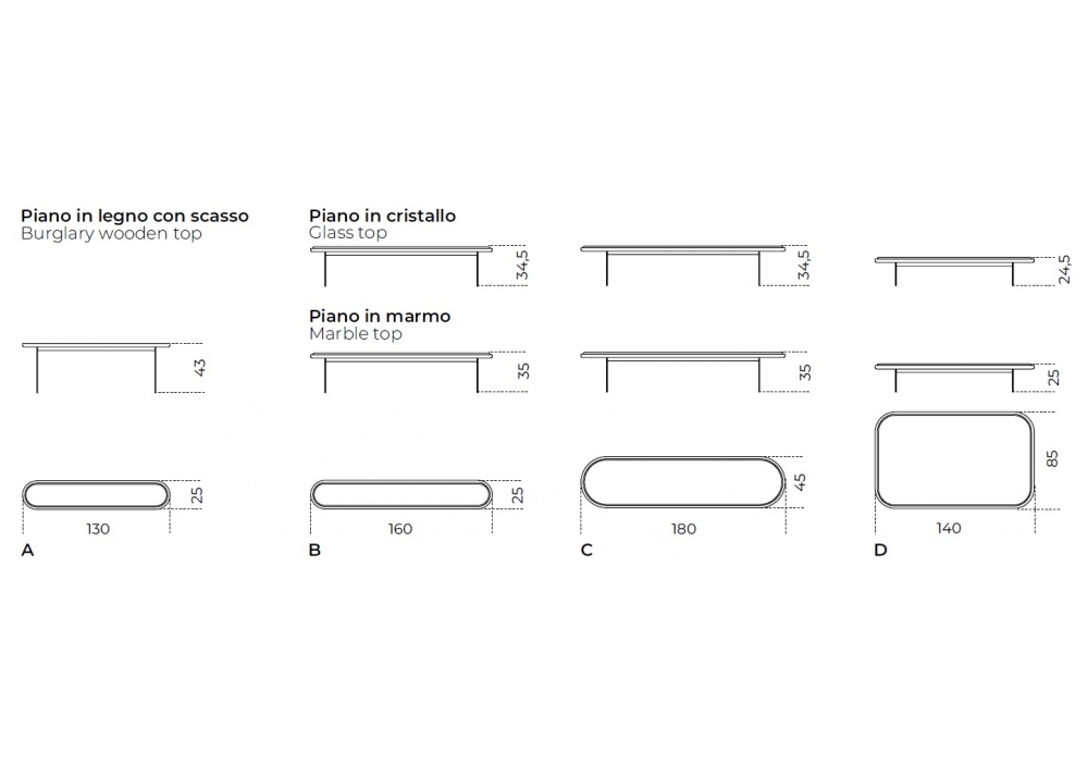 | Dimensions | 130 x 25 x H 43 cm (A); 160 x 25 x H 34,5 cm (B); 180 x 45 x H 34,5 cm (C); 140 x 85 x H 24,5 cm (D). |