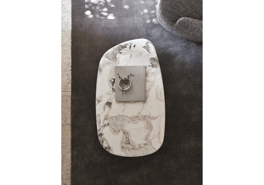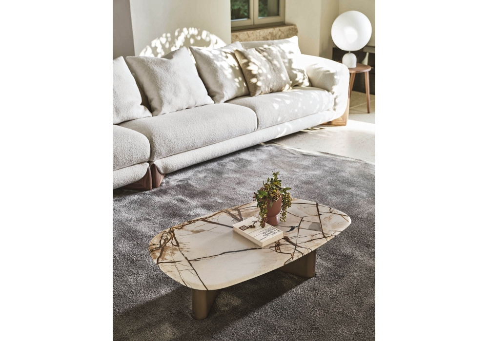 Callisto conçue par Carlo Ballabio pour Porada est une table basse réalisée avec base en bois laqué mat à pores fermés avec finition Bronzoro et plateau en marbre. Disponible en différentes dimensions.