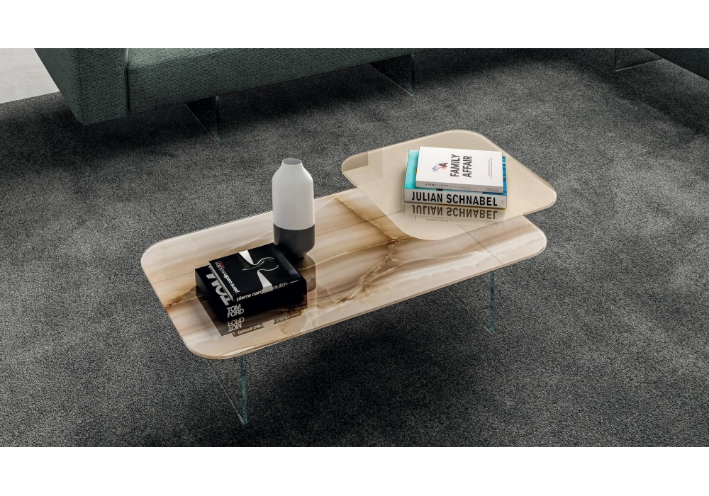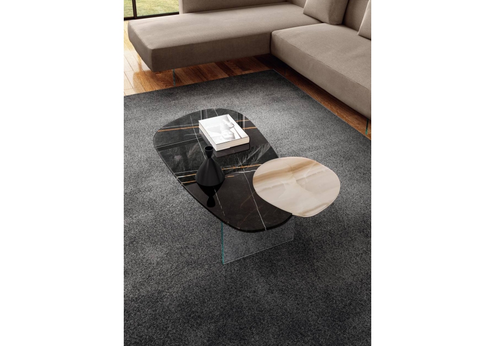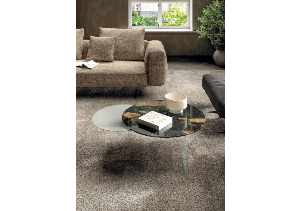 Blendie conçue par Daniele Lago pour Lago est une table basse avec plateau en verre sans joints, elle accueille des formes de différentes couleurs et finitions de matériaux, apparaissant comme une composition de plusieurs tables basses.