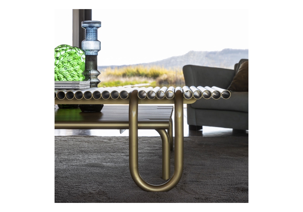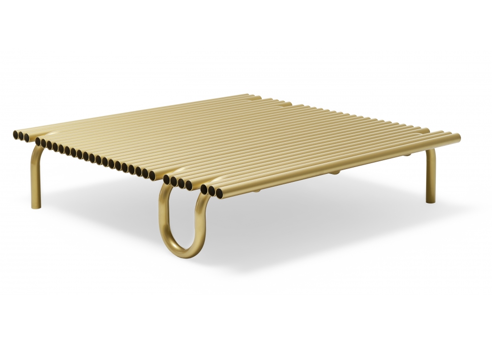 Pipelines conçue par Bcxsy pour Mogg est une table basse en métal disponible en or peint ou en noir texturé RAL 9017.