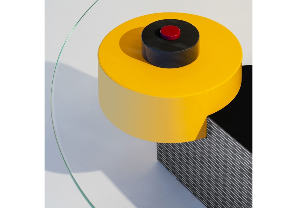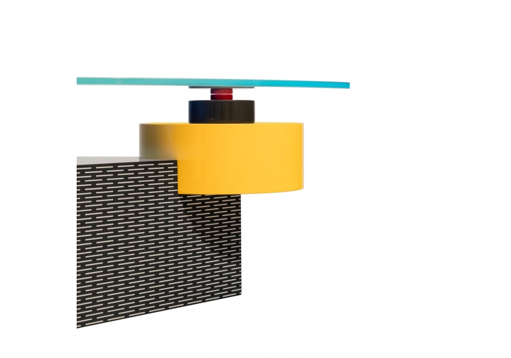 Atlas conçue par Aldo Cibic pour Memphis Milano est une table basse en bois laqué et recouverte de stratifié décoratif et plateau en verre.