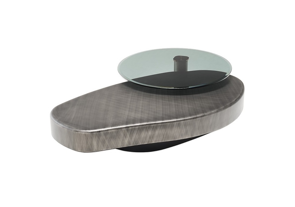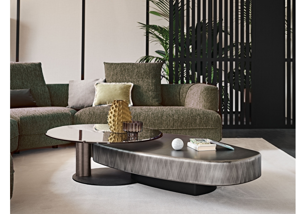 Arena Long Bond conçue par Yasuhiro Shito pour Cattelan Italia est une table basse composée d'une table basse principale accompagnée d'une petite table ronde avec base en acier laqué noir gaufré, colonne en acier laqué Brushed Bronze ou Brushed Grey et plateau pivotant en verre biseauté fumé.