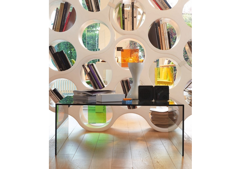 Smoke conçue par Marcel Wanders pour Cappellini est une table basse en verre trempé fumé (faces supérieure et plateau) et transparent (faces inférieures).