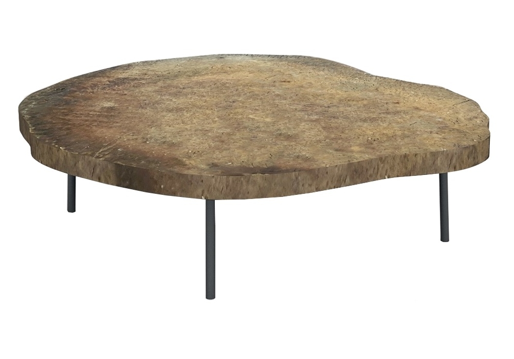 Disco Jarrah conçue par C.R. & S. Riva 1920 est une table basse avec plateau en loupe de Jarrah, bois d'Australie, et équipée de pieds tubulaires en fer.