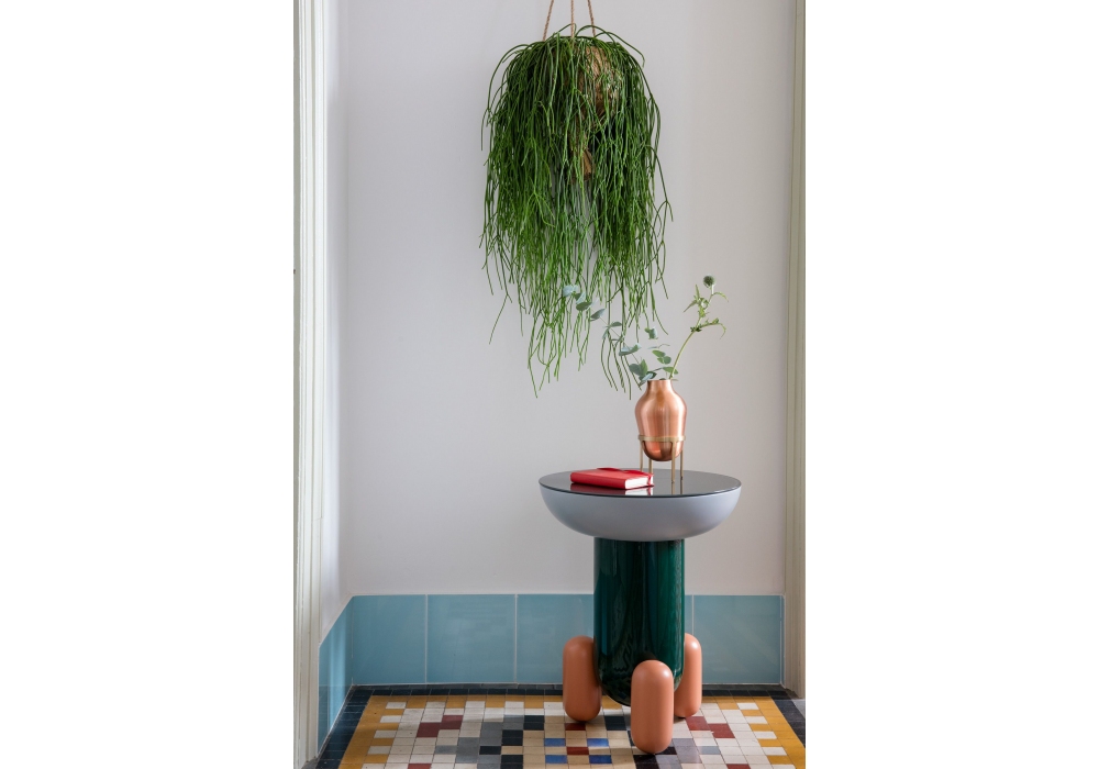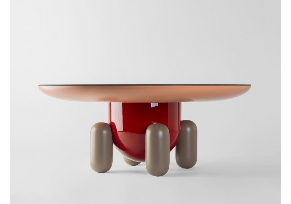 Explorer conçue par Jaime Hayon pour BD Barcelona Design est une table basse multicolore ou monochrome, la structure est en fibre de verre laquée, les pieds en bois massif tourné et laqué. Plateau de table en verre peint. Disponible en différentes finitions et tailles.