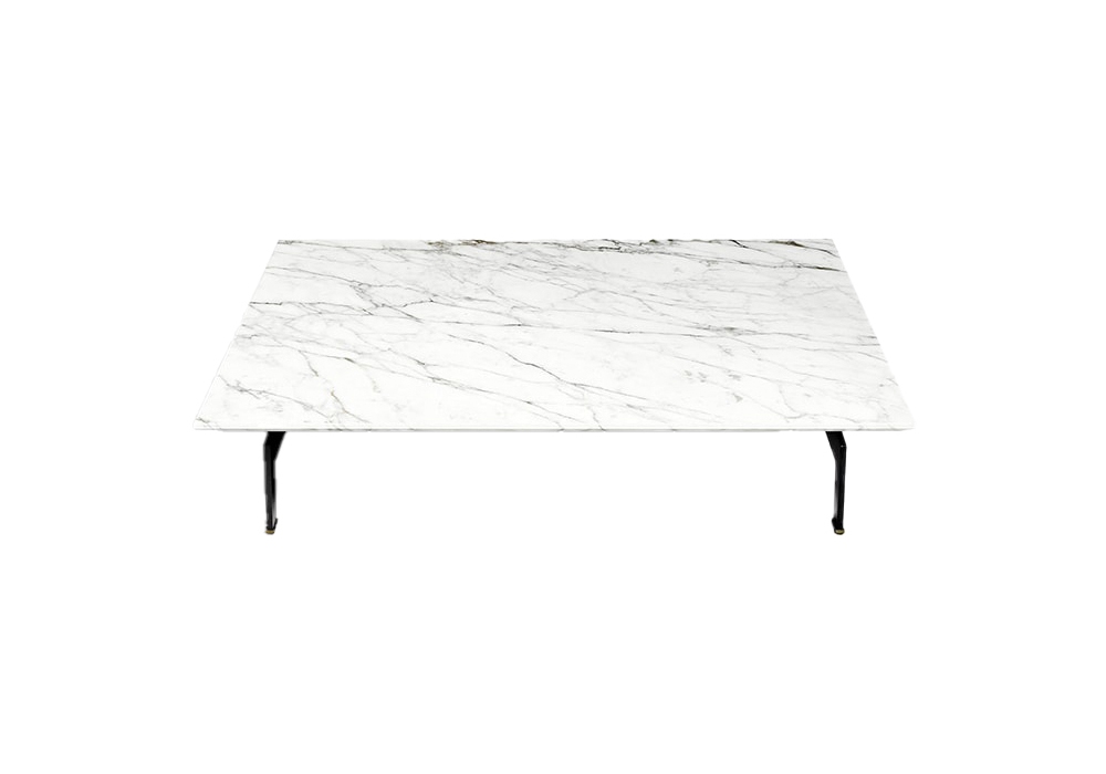 Flying Landscape conçue par Piero Lissoni pour DePadova est une table basse en tôle d'acier finie avec de la peinture acrylique grise rugueuse et des pieds en matériau thermoplastique couleur laiton. Le plateau est en marbre de différentes finitions. La table est disponible en différents modèles et tailles et avec la version à placer à côté du canapé.