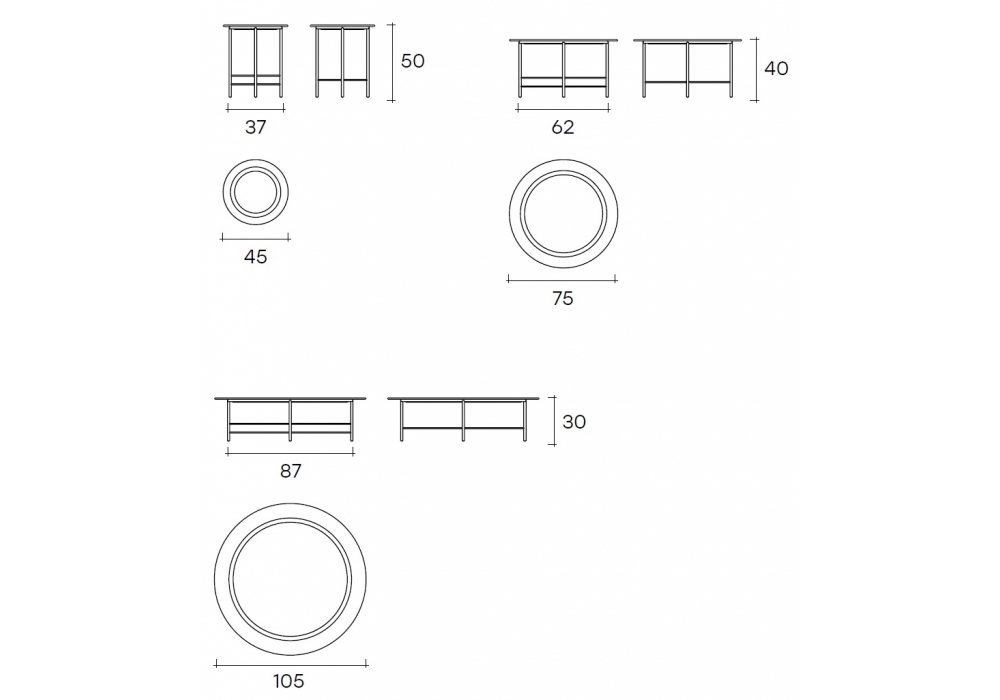 | Dimensions | Ø 45 cm x H 50 cm; Ø 75 cm x H 40 cm; Ø 105 cm x H 30 cm. |