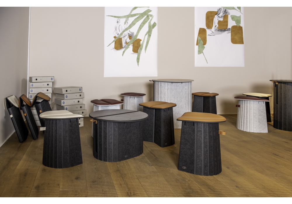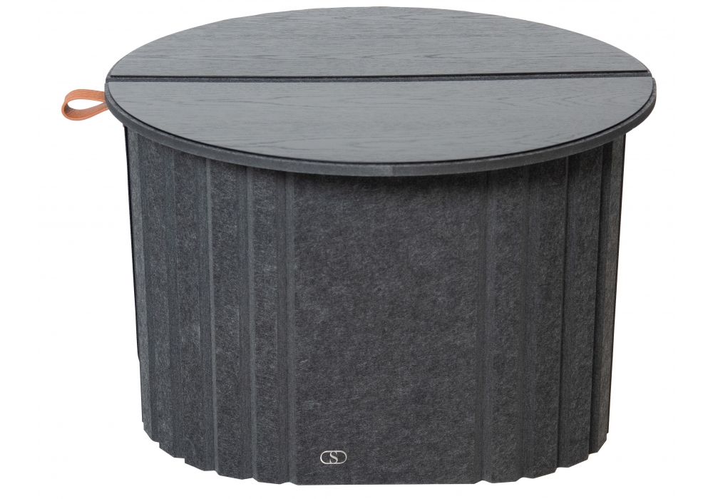 DS-5010 conçue par Simon Busse pour De Sede est une table basse pliante avec plateau en chêne, coque en feutre de polyester anthracite avec structure en métal enduit de poudre noire et poignées en cuir de différentes finitions. Disponible en deux dimensions.