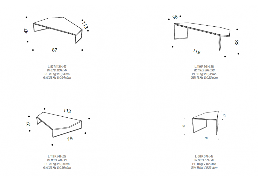 | Dimensions | - 87 x 113 x H 47 cm; - 74 x 113 x H 27 cm; - 119 x 38 x H 36 cm; - 68 x 57 x H 47 cm. |