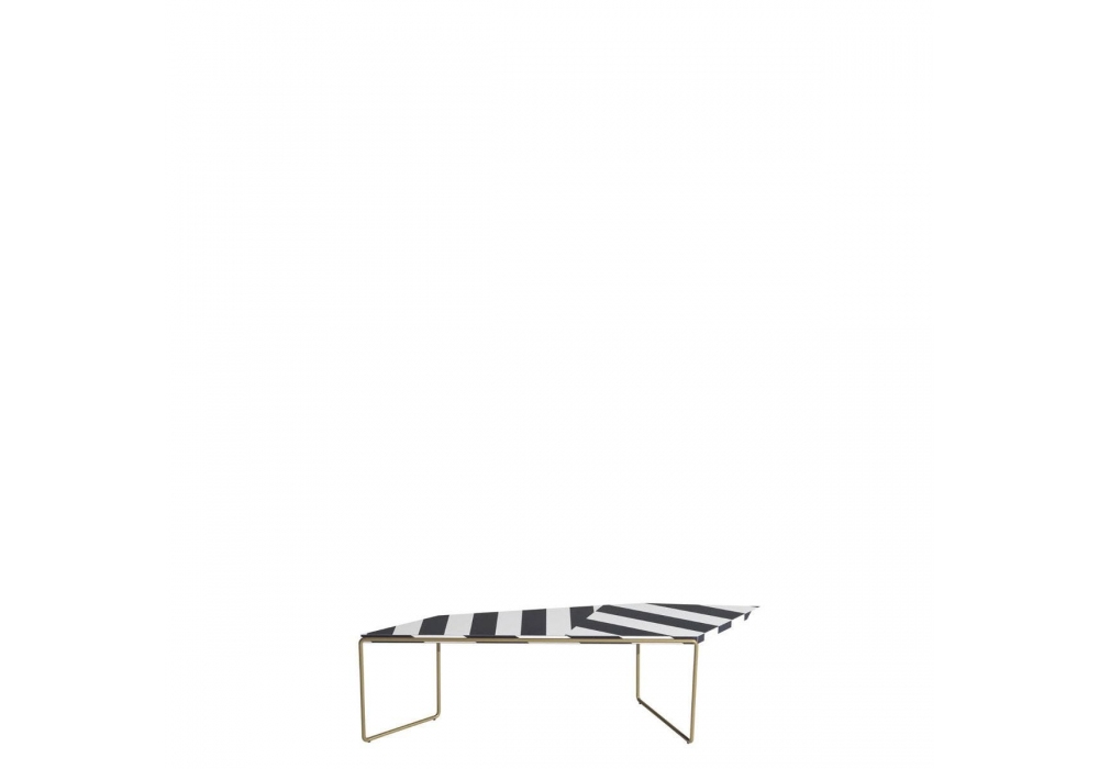 Zagazig conçue par Driade Lab pour Driade est une table basse en tige d'acier peinte avec de la poudre de polyester de couleur or. Dessus et graphiques en bi-laminé avec décoration florale ou rayée, réalisés en impression numérique. La version avec la décoration rayée comprend la table basse L. 113 P. 74 H. 27 avec une décoration blanche et rouge, tandis que dans les trois autres tailles avec une décoration noire et blanche. Usage interne uniquement.