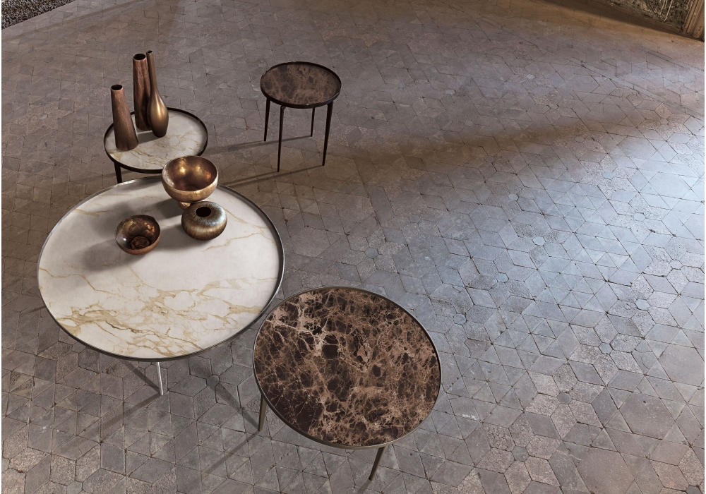 Sirio conçue par Giuseppe Bavuso pour Alivar est une table basse réalisée avec structure et structure en acier inoxydable peint, chromé ou nickel noir. Plateau en chêne noir, chêne traité thermiquement en cales, en MDF laqué, en marbre ou en céramique, couplé à du verre transparent extra clair. Marbre satiné (opaque) sur demande. Disponible en différentes finitions et dimensions.
