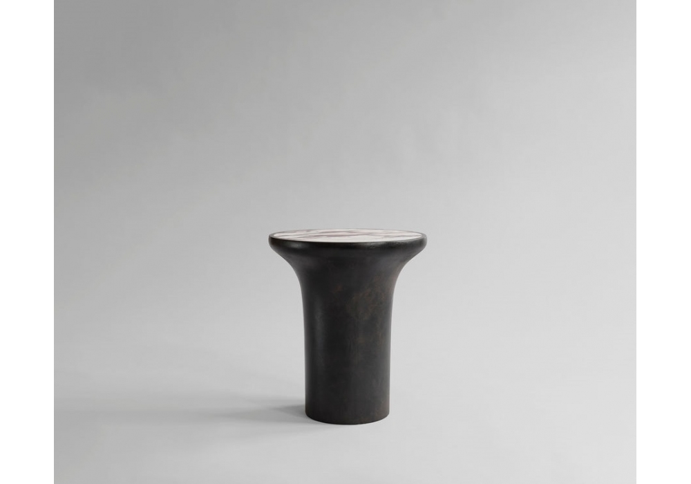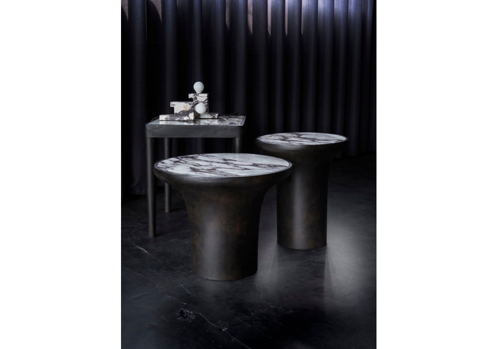 Trumpet conçue par Kristian Sofus Hansen & Tommy Hyldahl pour 101 Copenhagen est une table basse en fibre de ciment dans la finition café et plateau en marbre Calacatta. Disponible en différentes tailles.