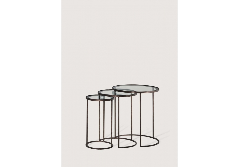 Salvatore Nest Of Tables conçue et produite par Porta Romana est une série de tables d'appoint circulaires de différentes tailles structurées en acier forgé peint. Les plateaux sont en verre trempé. Les tables gigognes Salvatore sont disponibles en différentes finitions de structure et de plateau.
