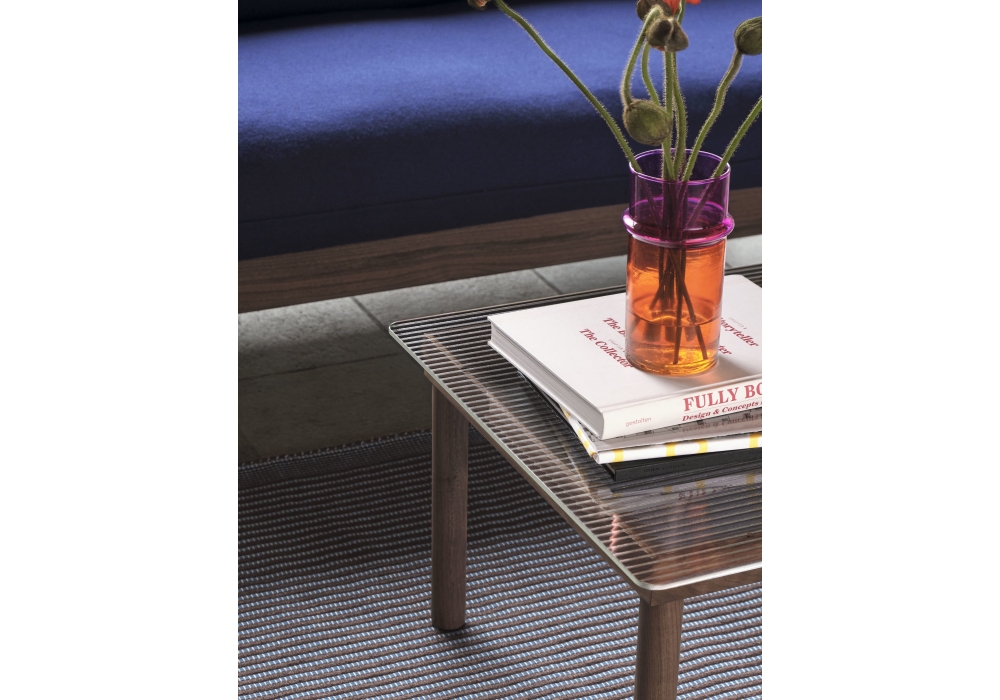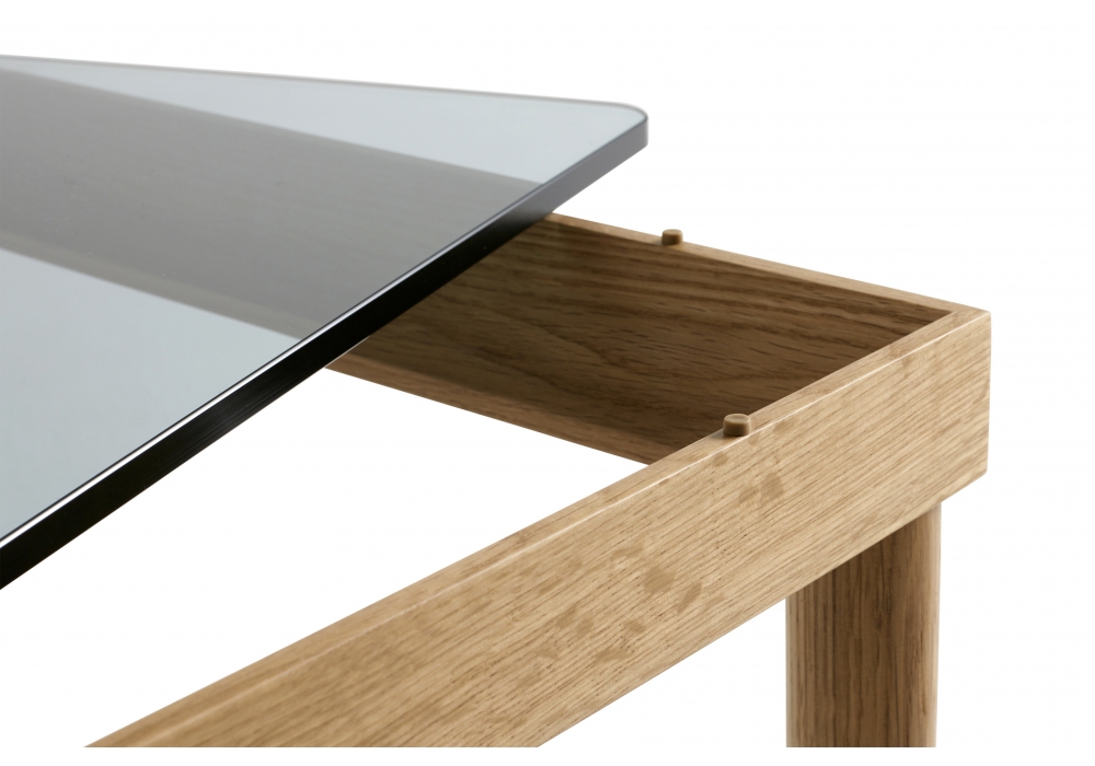 Kofi conçue par Martin Solem pour Hay est une table basse avec plateau en verre trempé transparent, coloré ou nervuré transparent. Structure et pieds en chêne massif ou noyer avec équerres de renfort insérées. Disponible en différentes finitions et dimensions.