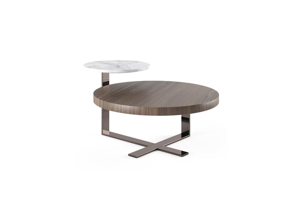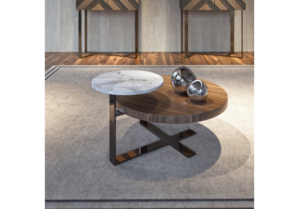 Two conçue et produite par Gual Design est une table basse composée de deux plateaux ronds en céramique avec une finition en marbre blanc et en bois plaqué. Base en acier inoxydable peint couleur nickel. Disponible en différentes finitions.
