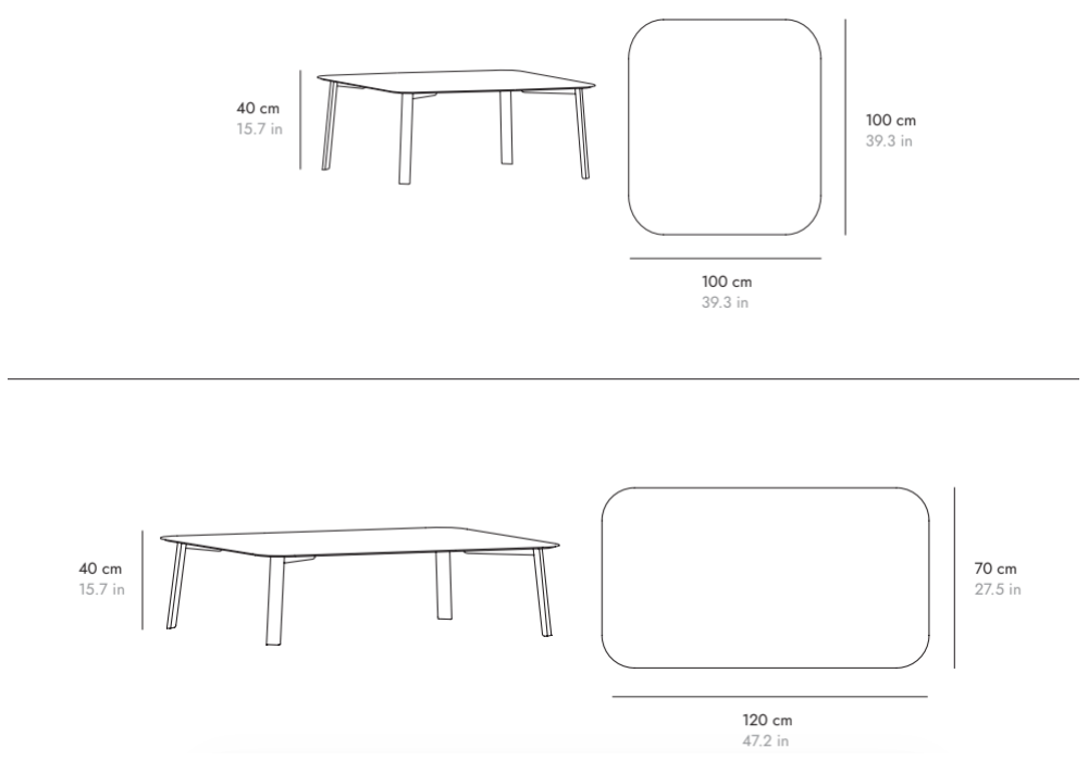 | Dimensions | 100 x 100 x H 40 cm; 120 x 70 x H 40 cm. |