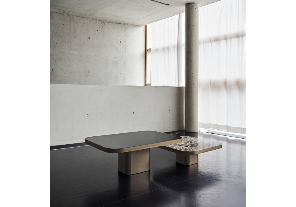 Bow No. 6 conçue par Guilherme Torres pour ClassiCon est une table basse réalisée en tôle de laiton massif, naturel ou bruni, laqué transparent. Plateau en verre laqué noir ou en marbre poli. Pieds en feutre, réglables en hauteur.