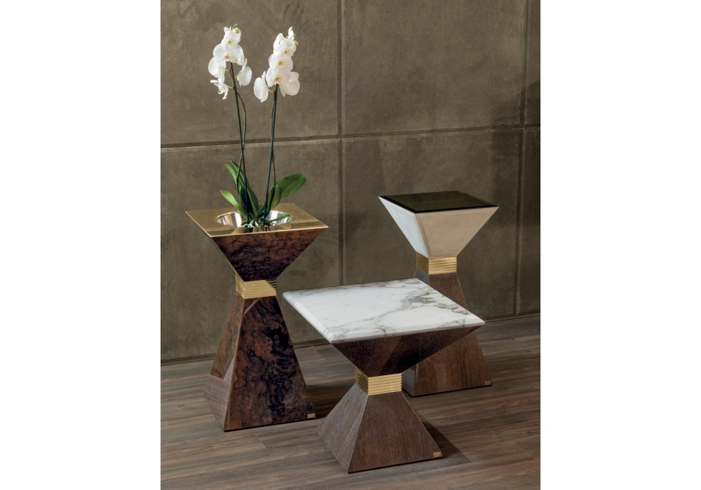 Andy conçue par Giuseppe Viganò pour Longhi est une table d'appoint modulaire en bois avec une base pyramidale. La structure est en essence de bois, en laque brillante ou recouverte de cuir. Plateau en miroir ou marbre. Sur demande, il est disponible avec le module supérieur dans une finition différente ou avec un trou de récipient en métal.