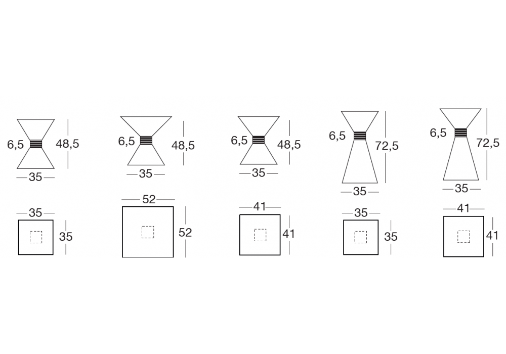 | Dimensions | 35 x 35 x H 48.5 cm; 52 x 52 x H 48.5 cm; 41 x 41 x H 48.5 cm; 35 x 35 x H 72.5 cm; 41 x 41 x H 72.5 cm. |