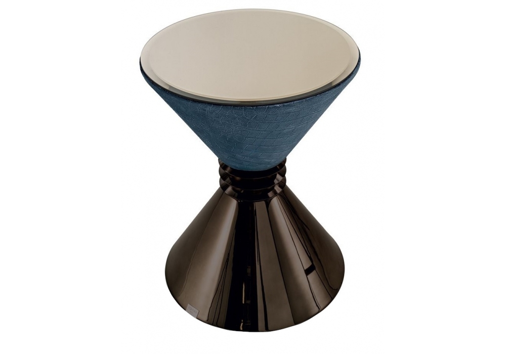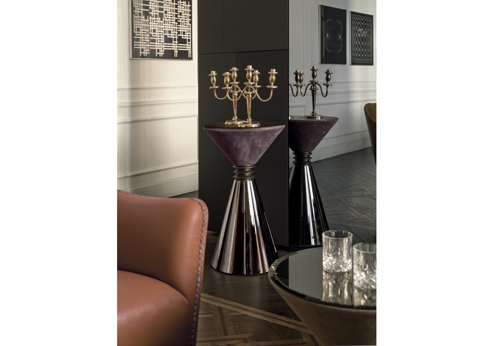 Angie conçue par Giuseppe Viganò pour Longhi est une table d'appoint modulaire en métal avec base conique, partie supérieure recouverte de cuir et plateau en miroir ou marbre. Insert en métal tourné poli ou mat. Sur demande, il est possible de configurer la base et la partie supérieure dans différents matériaux et finitions.