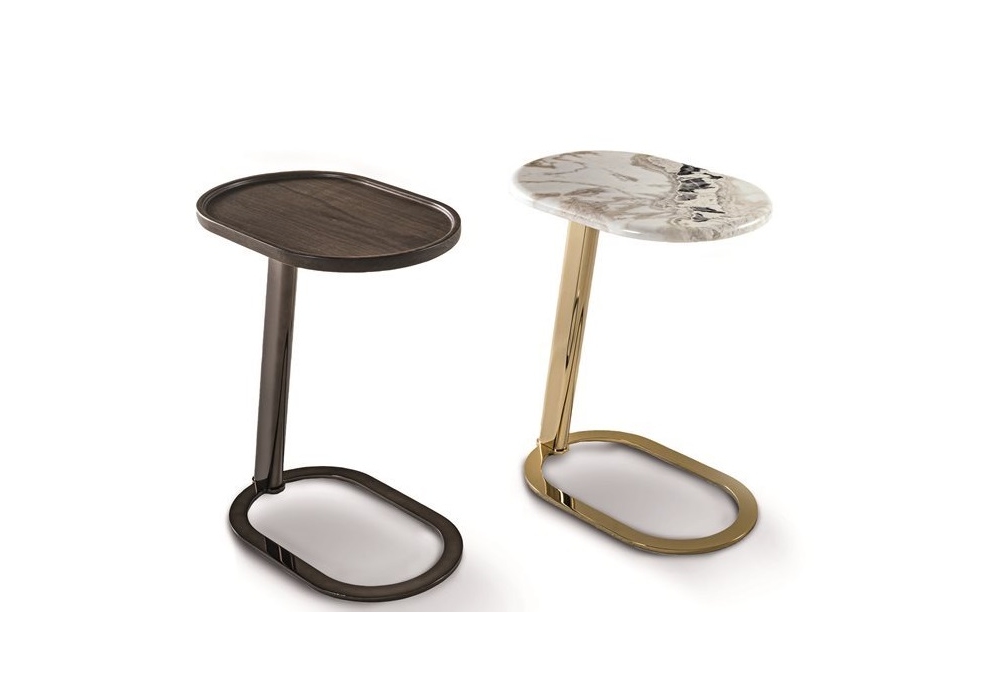 Kobe conçue par Giuseppe Iasparra pour Longhi est une table d'appoint avec structure en métal découpé au laser en finition brillante ou mate et plateau en marbre ou façonné en Noyer Canaletto teinté Macadamia.