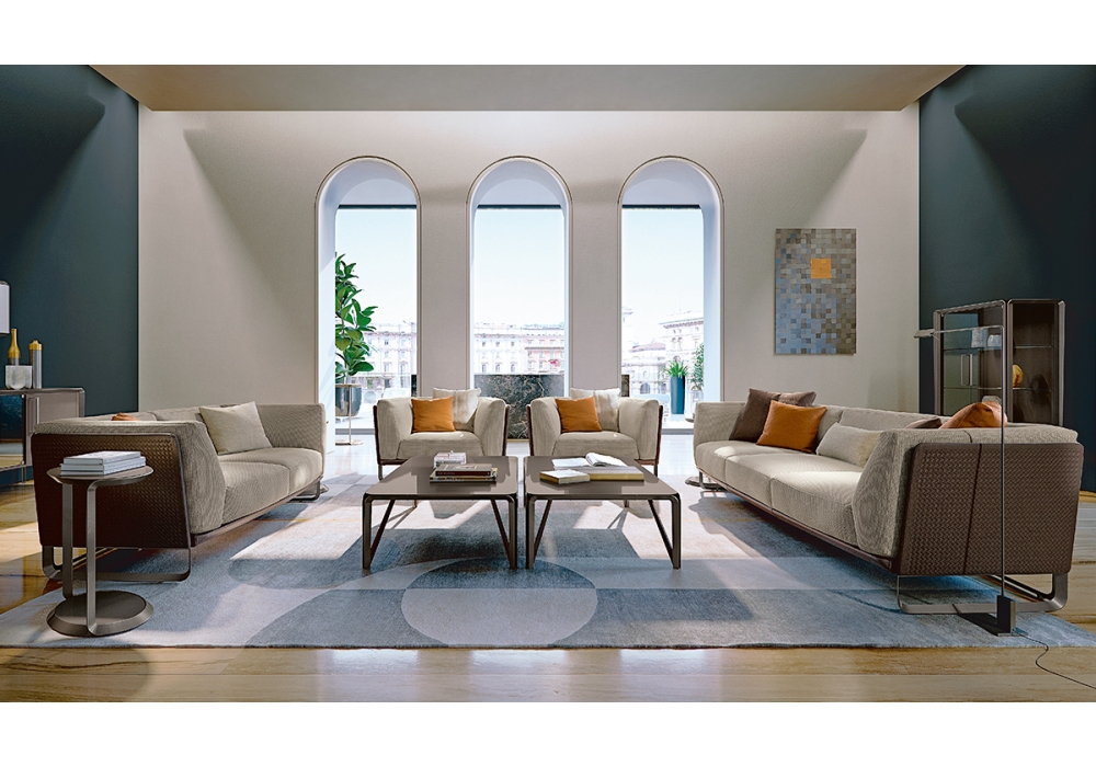 Milano conçue par Blengini Ghirardelli pour Turri est une table basse avec structure en métal finition nickel brossé avec inserts en cuir et plateau en MDF finition polyester laqué brillant.